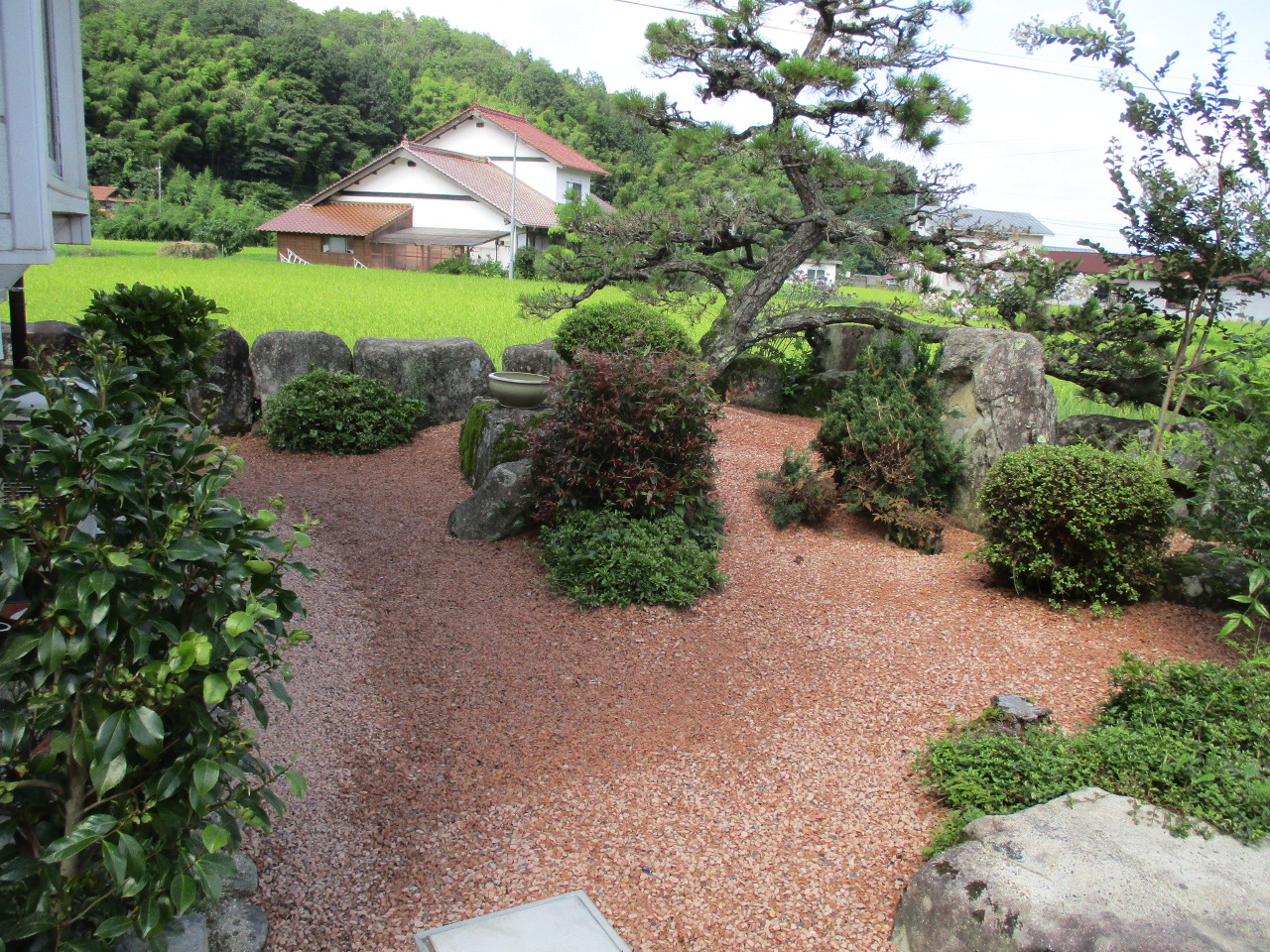 約3~5㎝掘り、防草シートを敷き詰めて、5~13㎜のサイズのセラミックサンドを5㎝以上敷きました。